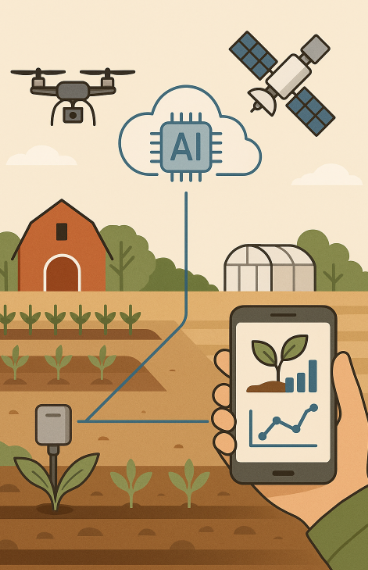 AI 농업 진단 시스템은 농업 데이터의 수집, 분석, 그리고 피드백 제공이라는 세 가지 축으로 이루어진다. 첫 번째 단계는 데이터 수집이다. 농장 곳곳에는 토양 센서, 기상 센서, 생육 센서가 배치되어 있다. 토양 센서는 수분 함량, 전기전도도, pH, 질소·인·칼륨 같은 주요 영양분 농도를 측정한다. 기상 센서는 온도, 습도, 일사량, 풍속, 강수량을 기록하고, 드론과 위성은 고해상도 이미지를 촬영해 작물의 생육 상태와 병해충 발생 여부를 확인한다. 이렇게 모인 데이터는 IoT 게이트웨이를 통해 클라우드 서버로 전송된다.